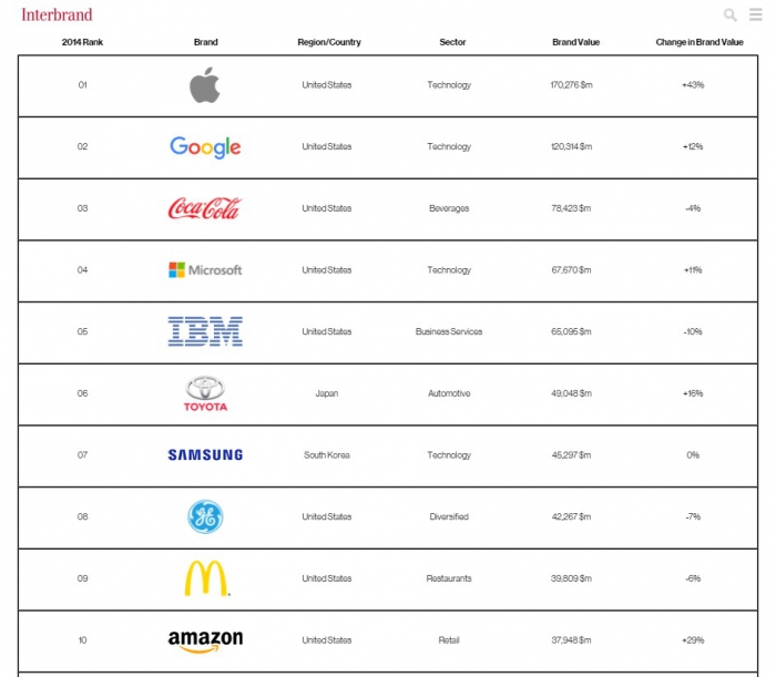 По сравнению с предыдущим рейтингом, стоимость бренда Apple выросла на 43% до 170,276 млрд долларов. На втором месте, как и два предыдущих года, расположился другой высокотехнологичный гигант - компания Google, прибавившая 12% к своей стоимости, которая достигла 120,314 млрд долларов. Тройку лидеров замкнула корпорация Coca-Cola, несмотря на то, что стоимость бренда по сравнению с прошлым годом уменьшилась на 4% до 78,423 млрд долларов.