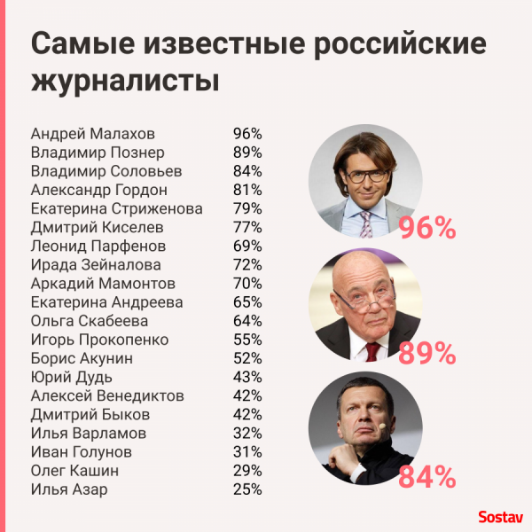 Андрей Малахов открывает список самых известных российских журналистов. На втором месте — Владимир Познер, его назвали 89% опрошенных. Однако популярность Познера выше в Москве и Санкт-Петербурге — 92% и 93% соответственно. В аудитории старше 45 лет Познера знают 94% опрошенных, а в возрасте от 16 до 34 лет — 79%.