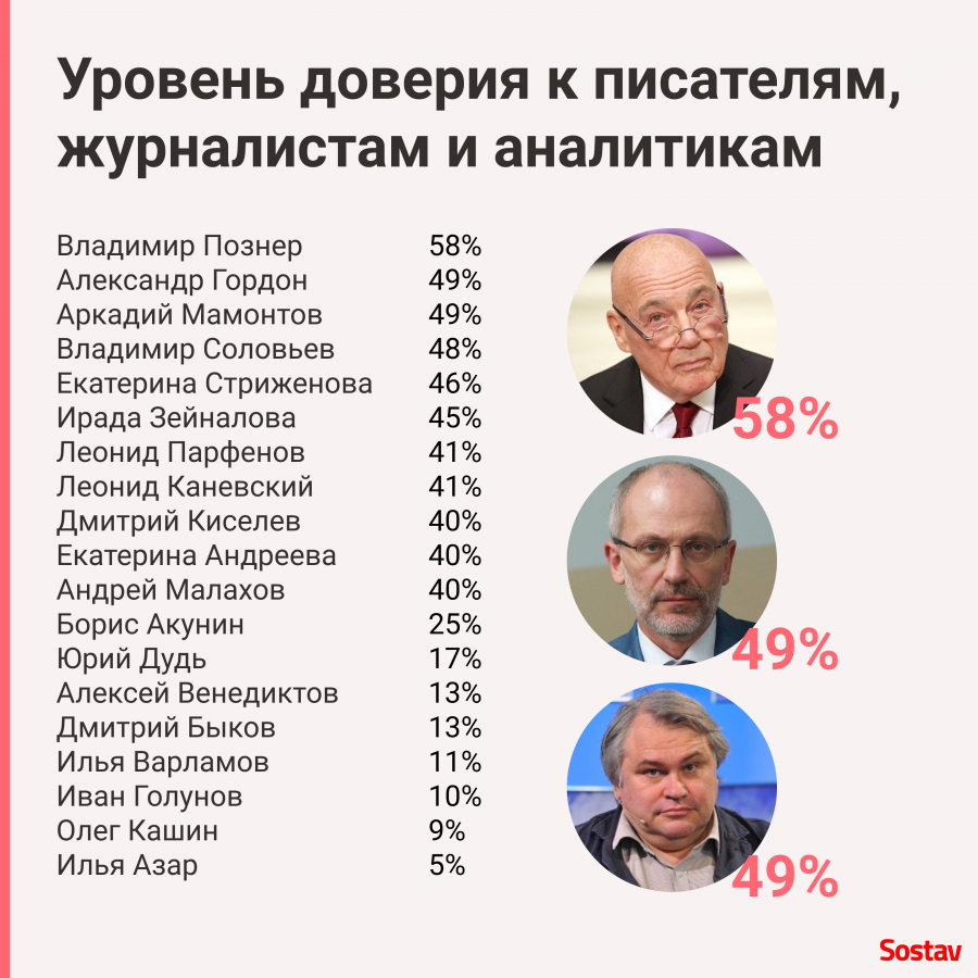 Что касается уровня доверия журналистам, аналитикам и писателям, то здесь топ возглавляет Владимир Познер — к нему прислушивается 58% опрошенных. Также в лидерах Александр Гордон (49%), Аркадий Мамонтов (49%), Владимир Соловьев (48%), Екатерина Стриженова (46%) и Ирада Зейналова (45%). Несмотря на то, что Андрей Малахов самый известный журналист, ему доверяет только 40% опрошенных.