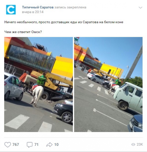 Необычного курьера запечатлели на улицах города 12 августа. Фотографии попали в паблик «Типичный Саратов» с комментарием: «Чем же ответит Омск?»