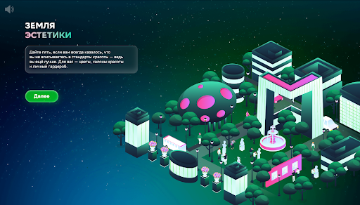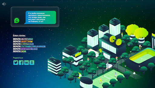 После прохождения небольших квизов о каждой локации участник получает информацию о самых выгодных акциях и предложениях, характерных для его Земли (например, гурманов ждёт предложение в кафе и ресторанах, эстетов — актуальные акции для шопинга).