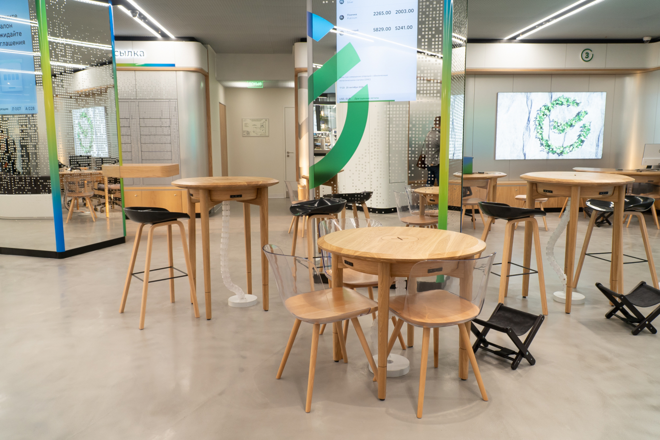Новое пространство стало открытым, трансформируемым и безбарьерным. Все традиционные и новые услуги можно получить в любом удобном для клиента месте офиса. Сотрудники работают с планшетами, а все кассовые операции выполняет электронный кассир.