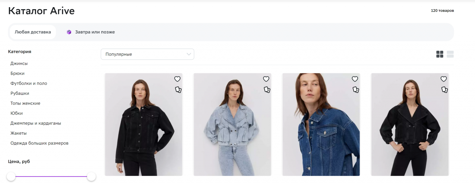 Arive позиционируют как бренд базовой одежды. В ассортименте — юбки, джинсы, рубашки, футболки, кардиганы, свитеры. Цены начинаются с 1 тыс. 190 руб.
