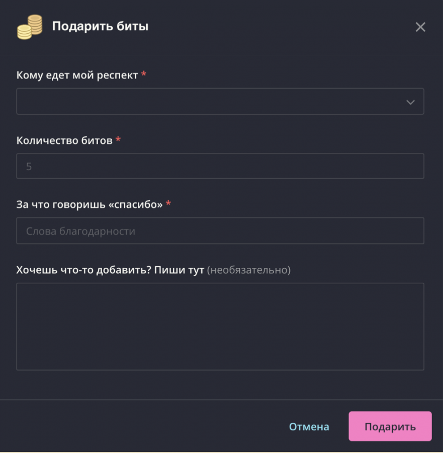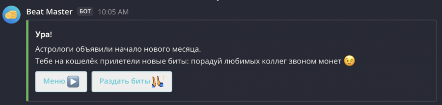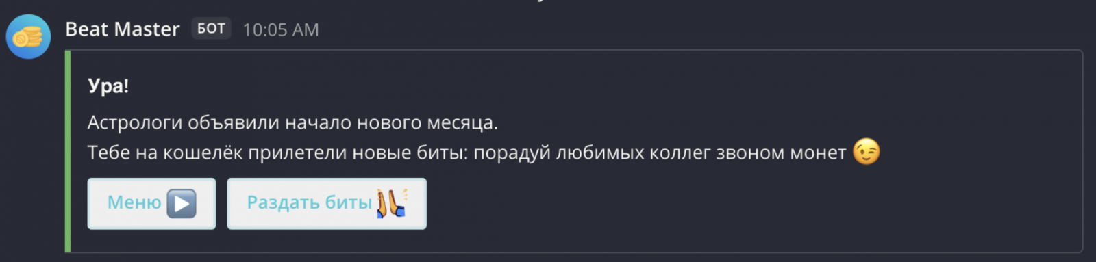 Управлять балансом можно через бота в нашем корпоративном мессенджере. Сотрудники отправляют друг другу «респекты» из «Дарилки» с помощью функции «Раздать биты». Начислить подарочные биты самому себе нельзя.