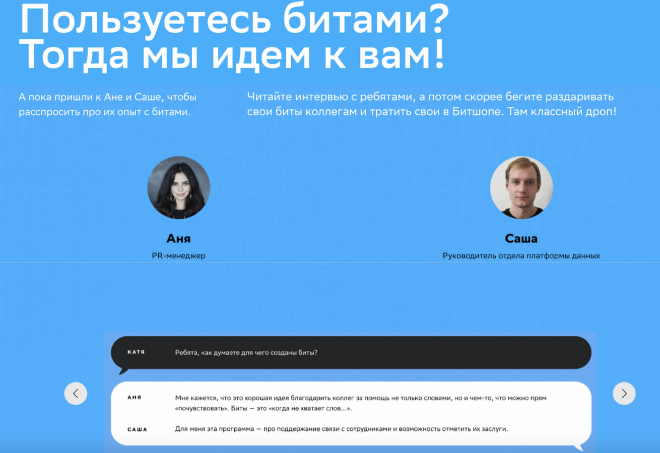 Сотрудники не только участвуют в программе, но и предлагают идеи по ее улучшению и обновлению ассортимента «БитШопа». Лучшие предложения мы берем в проработку, и, конечно, ежемесячно начисляем биты в «Дарилку», чтобы они не заканчивались, ведь важно говорить «спасибо» друг другу постоянно.