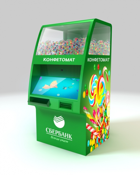 Специально для Сбербанка агентство Deluxe Interactive совместно с Maxus Global разработало Конфетомат - уникальный детский банкомат, который выдает не деньги, а конфеты. Чтобы их получить, нужно правильно ответить на вопросы про финансы и решить несложные задачки.