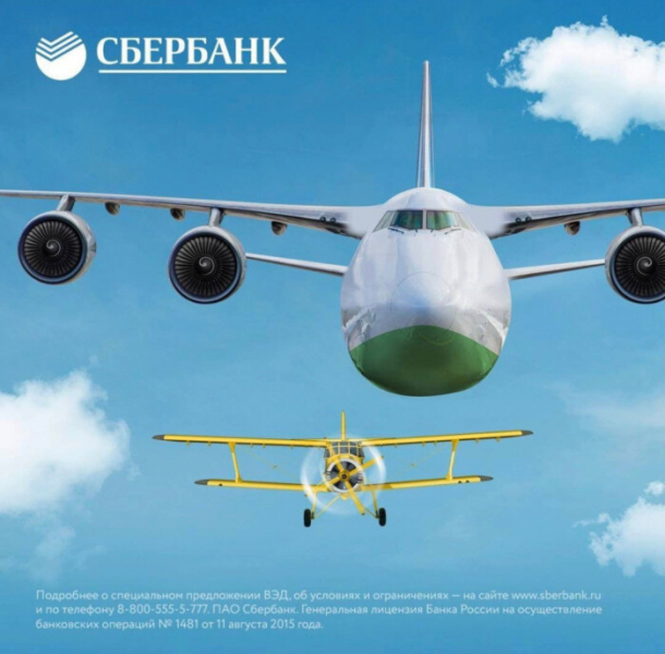 Ненавязчивым троллем на этот раз выступил Сбербанк. Первым его шутливую кампанию заметил пользователь VC. На имиджах для своей рекламы в соцсетях банк изобразил по два средства передвижения — самолеты, корабли, автомобили. Разница в них проста: один объект олицетворяет Сбербанк — он большой, красивый и мощный, другой — один из банков-конкурентов. Так, например, большой самолет сравнивается с кукурузником, а корабль — с лодкой.