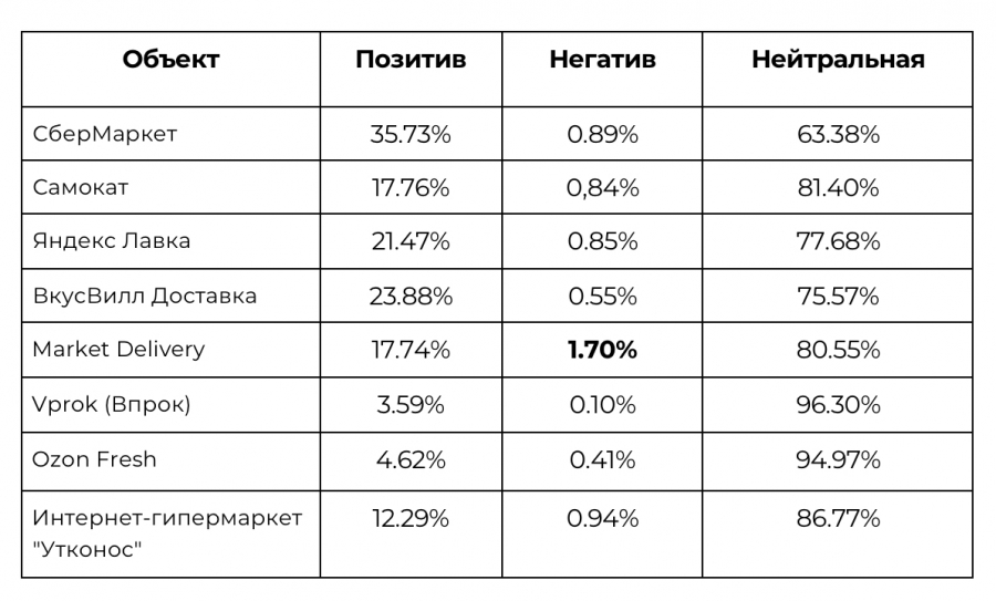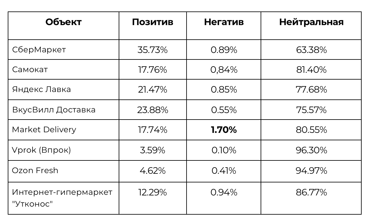 Лидером по доле негативных упоминаний был признан Market Delivery (1,7%). На втором месте «СберМаркет» (0,89%), на третьем — «Яндекс Лавка» (0,85%). Лидерами по доле положительных упоминаний стали «СберМаркет» (35,73%), «Вкусвилл Доставка» (23,88%) и «Яндекс Лавка» (21,47%).