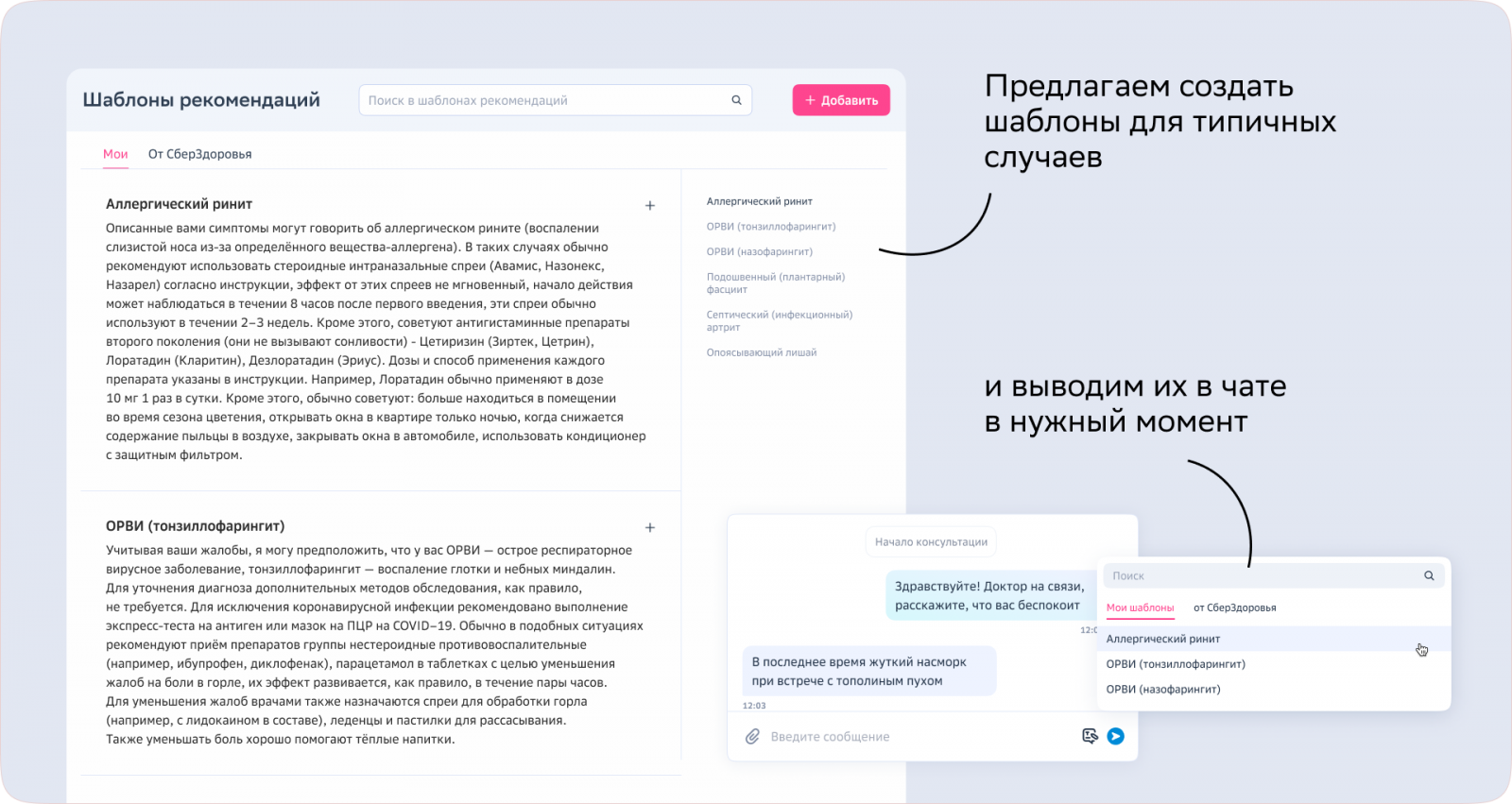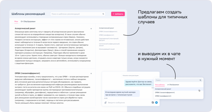 Вещь посложнее — рекомендации. Здесь пот, слёзы, труд и вся слава достаётся медицинскому блоку. Благодаря ему на каждую более-менее повторяющуюся проблему в админке есть куча рекомендаций, собранных с любовью к доказательной медицине. Врач может обратиться к таким шаблонам в любую минуту, не следуя им целиком, а корректируя под конкретную ситуацию пациента.
