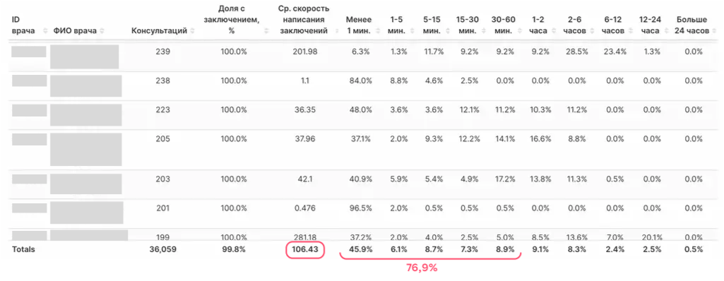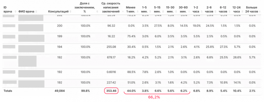 А теперь ещё раз посмотрим на результаты. Как изменилась скорость отдачи заключения пациенту после всех этих фич? Довольно круто — аж в три раза. В начале года мы видели, что в среднем врач отдаёт заключение пациенту через 353 минуты (при этом 66% врачей делают это в первый час).