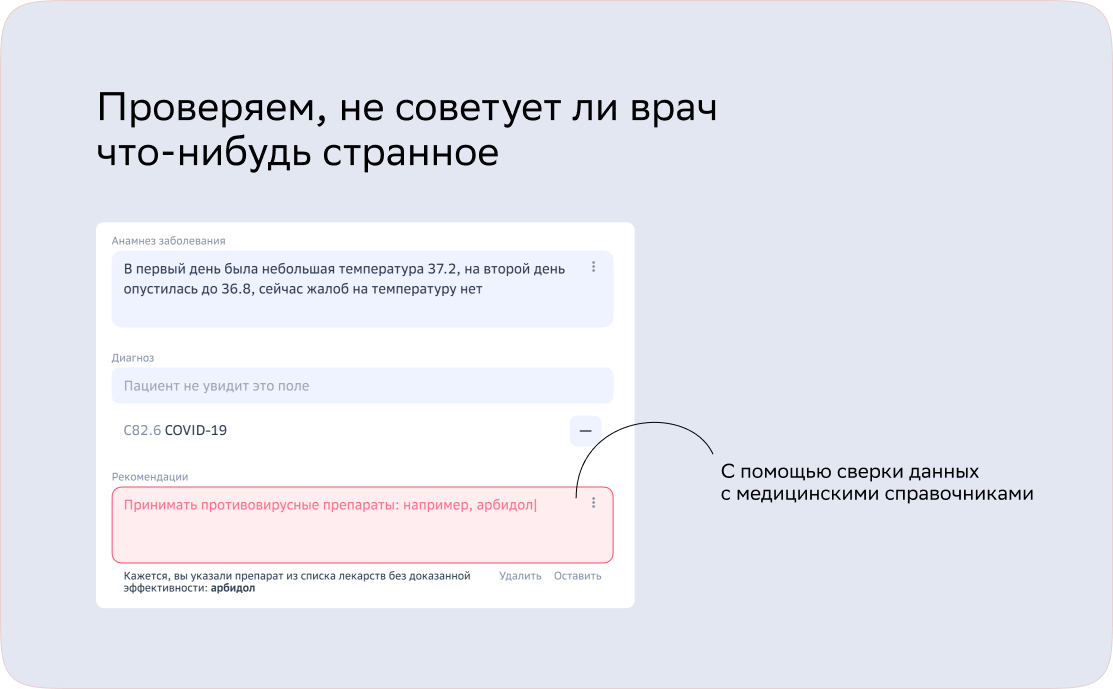 А ещё этот паттерн с подсказками внутри заключения здорово служит и для других целей — допустим, в борьбе за качество. Мы можем сверять содержимое заполненных полей с медицинскими справочниками и указывать врачу на препараты из списка.