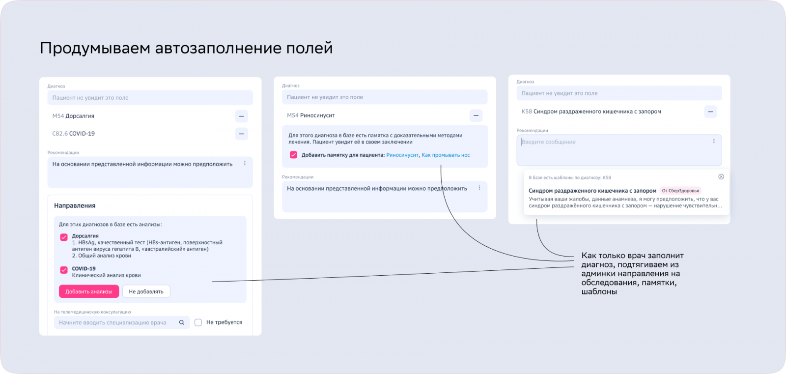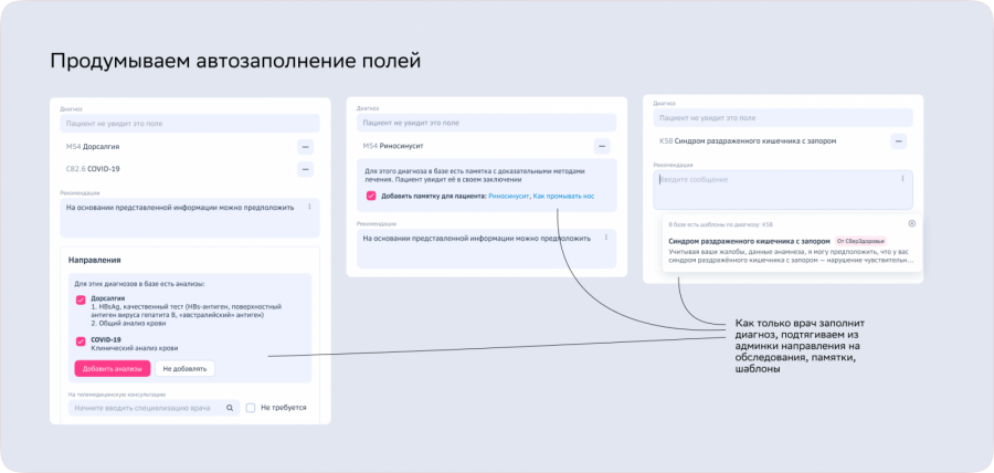 Зная диагноз, который поставил врач, мы привязываем к нему в базе набор рекомендаций на основании клинических данных и предлагаем врачу автоматом заполнить поля, а не вводить снова и снова одинаковые направления на анализы и пояснения по докмеду.