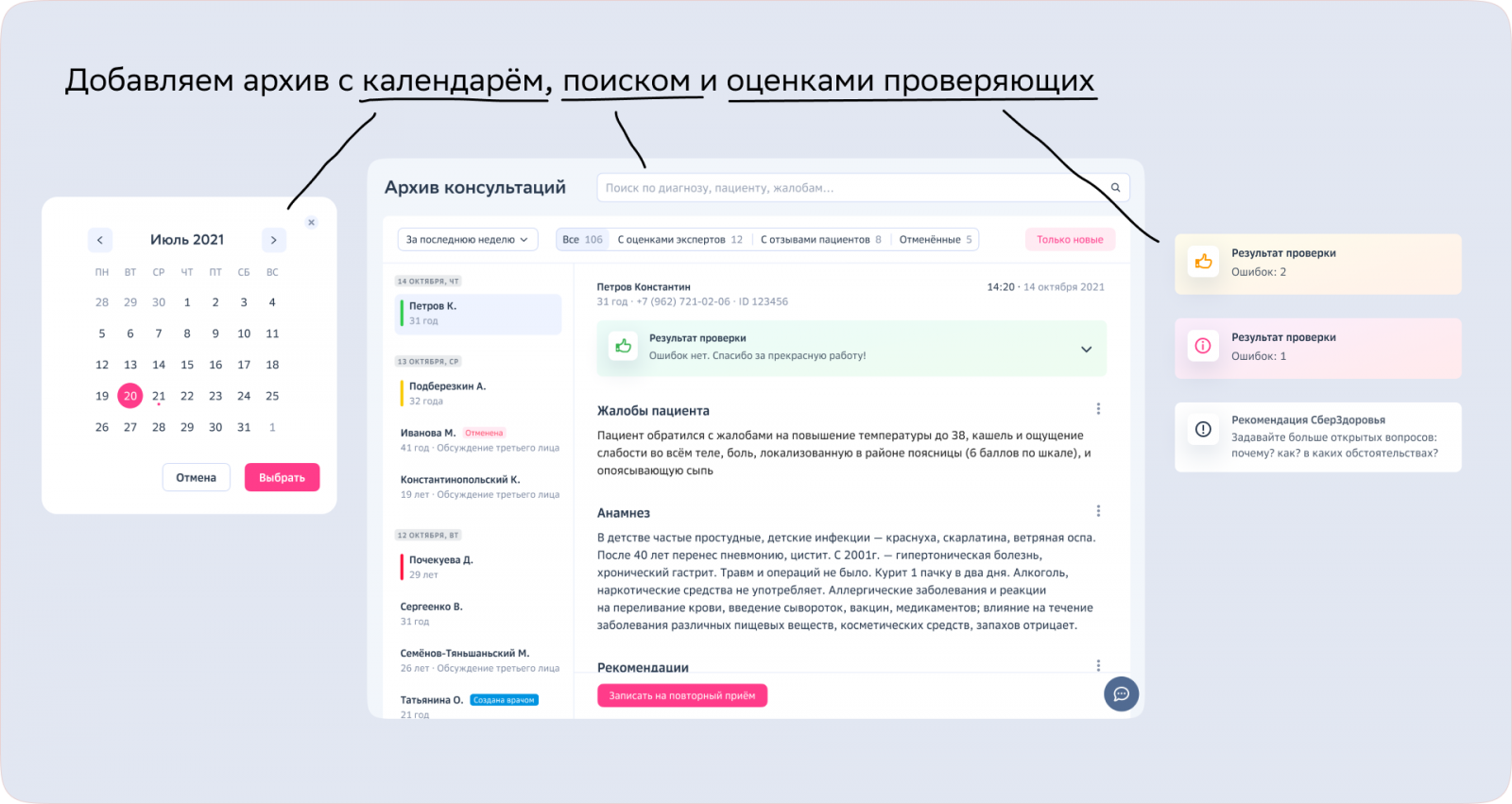 Где искать пациентов, которые были на приёме вчера? Или, например, где посмотреть, «норм» я как врач или не «норм»? Врачу должно быть понятно, какие оценки он получил и за что.