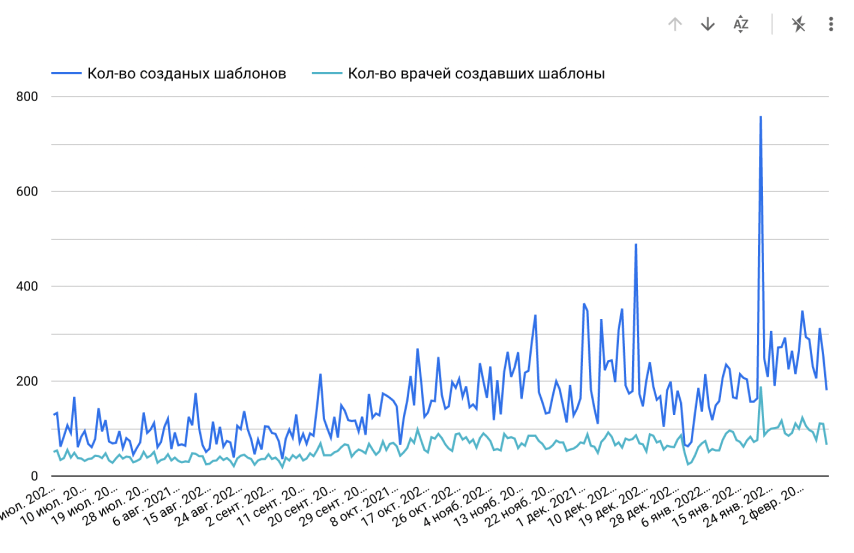 Запустив шаблоны, мы увидели постепенное возрастание интереса к ним. Пик на графике — тот день, когда мы выкатили очень крутые шаблоны рекомендаций: врачам не терпелось их попробовать. Сейчас мы работаем над тем, чтобы врачи пользовались шаблонами ещё чаще.