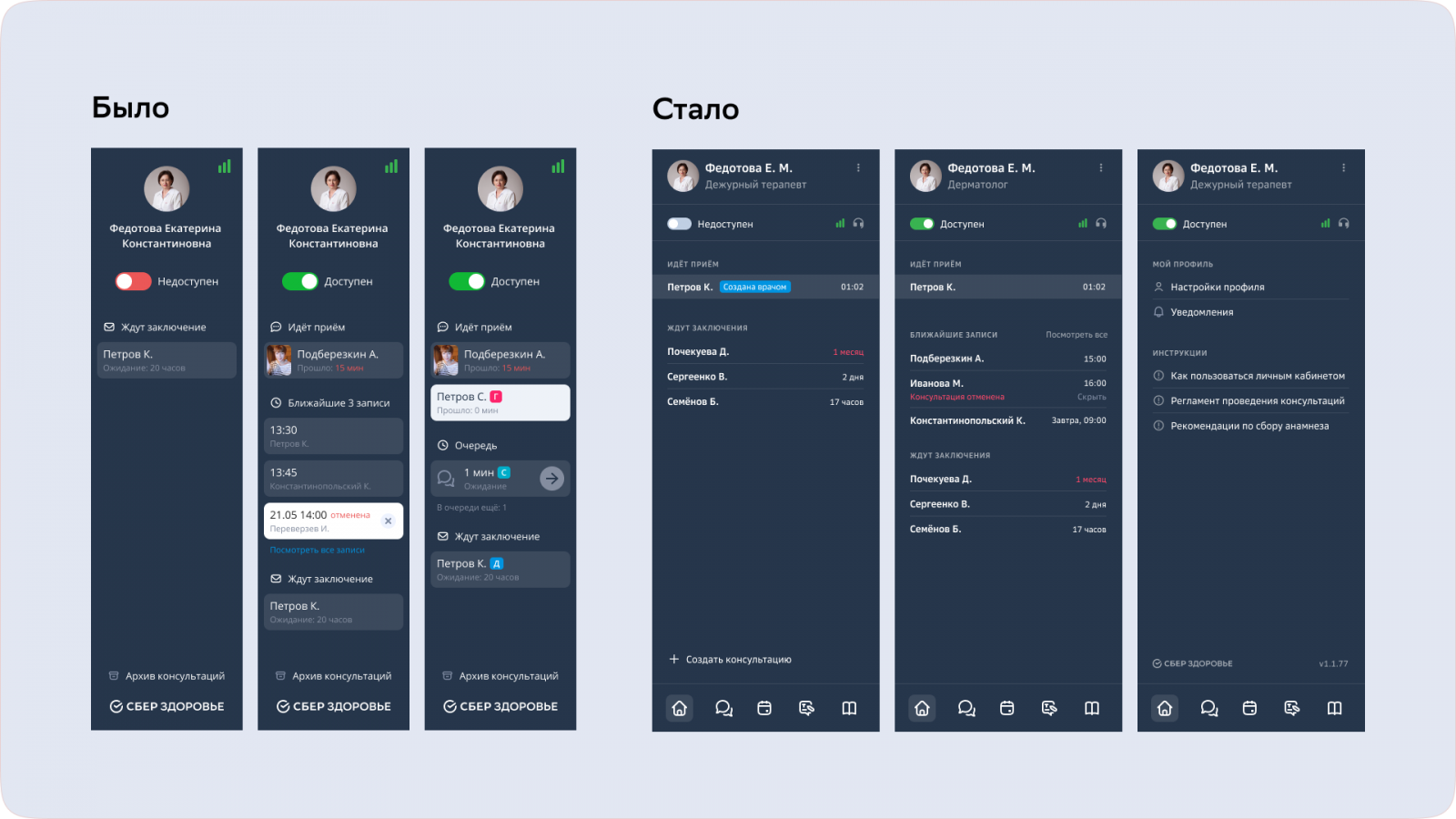 Вдобавок у нас были большие планы по расширению возможностей личного кабинета. Стало ясно, что без изменений навигации не обойтись — новые функции попросту некуда будет впихнуть, экран и так чересчур пестрит. Мы переделали навигацию, убедились, что врачам с ней ок, и взялись за новые разделы.