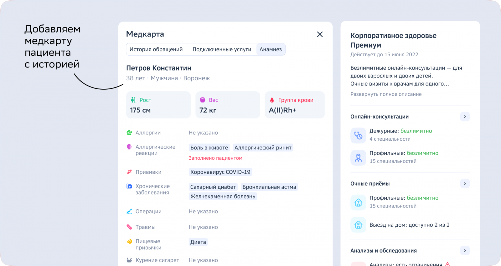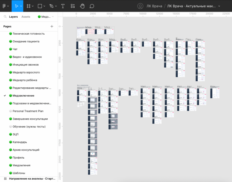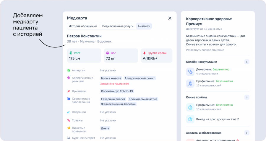 Всё это объединяется в личном кабинете. В ноябре 2022, когда выходит эта статья, он выглядит так (здесь и далее на макетах нет личных данных врачей или пациентов).