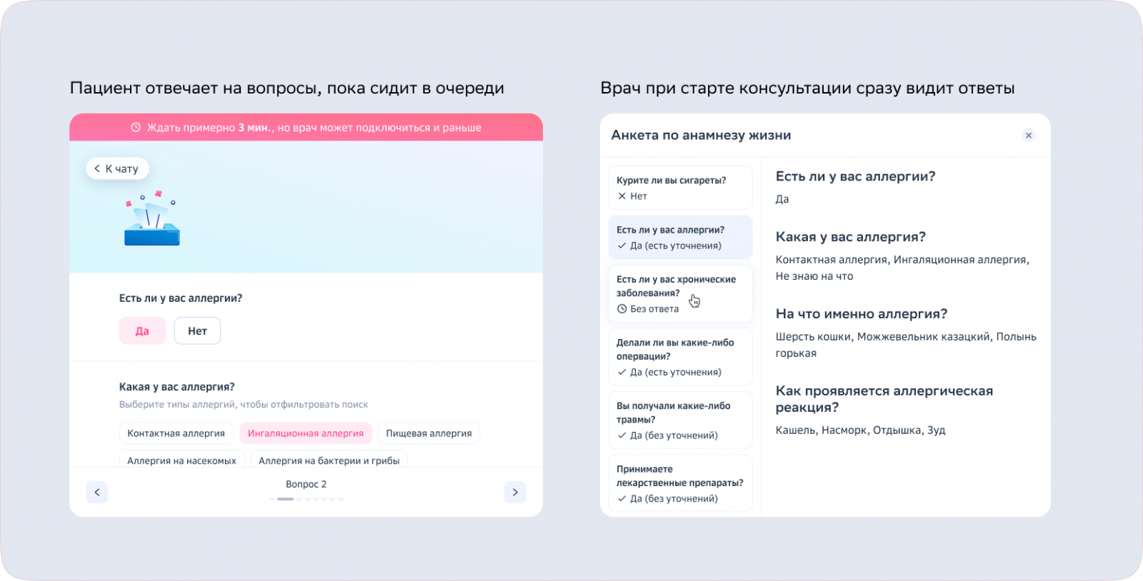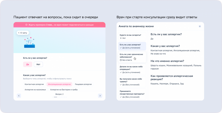 Как это работает: чтобы подобрать лечение, врачу нужно узнать не только симптомы, но и историю жизни пациента — рост, вес, аллергии, хронические заболевания. Список вопросов плюс-минус одинаковый для любой врачебной специальности. Пока пациент сидит в очереди, мы можем предложить ему пройти чат-бот — тогда на консультации врач сразу увидит ответы и перейдёт к ключевой проблеме.