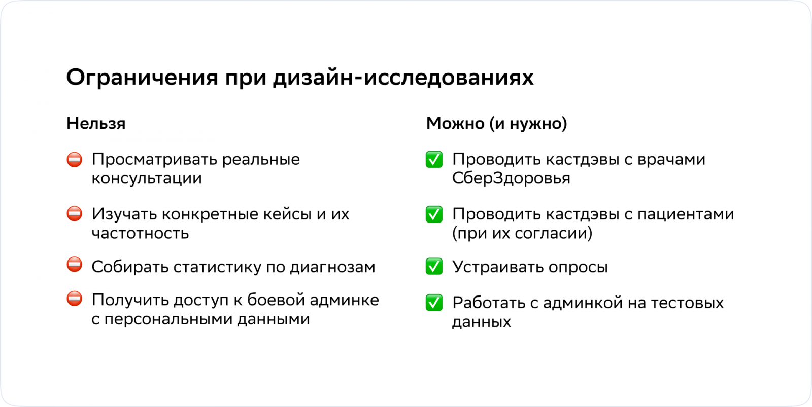 Ещё одно ограничение — строгая конфиденциальность. Для врачей это привычно, но для продуктового дизайнера может стать сюрпризом: изучить материал реальных консультаций невозможно, к ним физически нет доступа. Дизайнер узнаёт количество отправленных сообщений в рамках консультации, но не содержание этих сообщений, не имена пациентов и не их реальные проблемы.