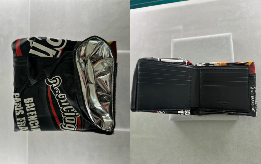 Модный дом на волне успеха выпущенных в 2022 году сумок в виде упаковки чипсов Lay’s представил кошельки. Только теперь на них вместо лого известных снеков нанесено название бренда. Изделие выполнено в разных цветах, его дизайн имитирует смятую упаковку чипсов.