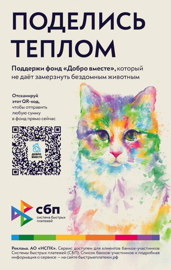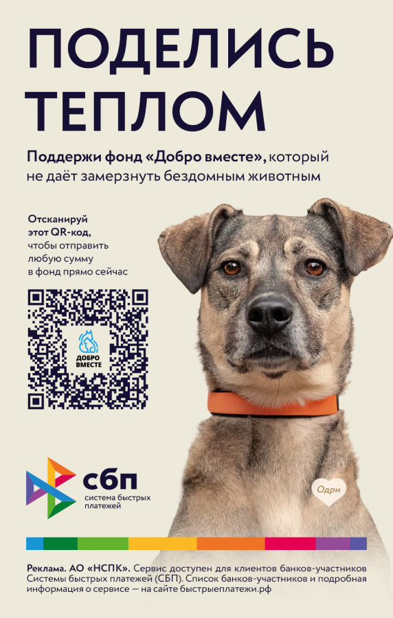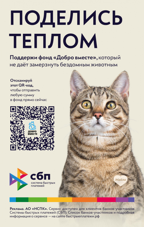 С приходом холодов бездомные животные испытывают большие сложности — пушистые герои не могут решить эту проблему с помощью тёплых вещей, а благотворительным организациям не хватает средств на отопление помещений. Команда СБП, креаторы агентства Affect и фонд «Добро вместе» запустили акцию «Поделись теплом», чтобы согреть четвероногих друзей человека по QR-коду.