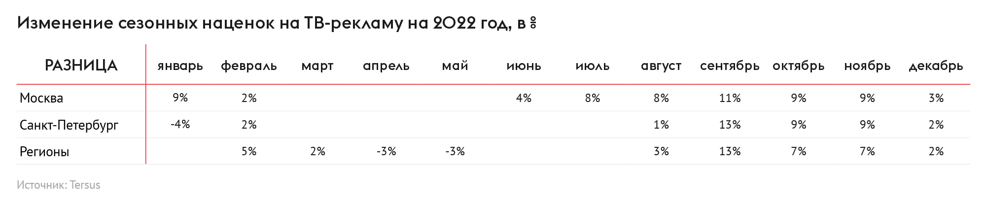 Также произошло повышение наценок за обычное фиксированное размещение в праймтайм на «Первом канале», НТВ, «Матч ТВ» — на 4%, ТВ-3 и «Пятница» — на 6%.