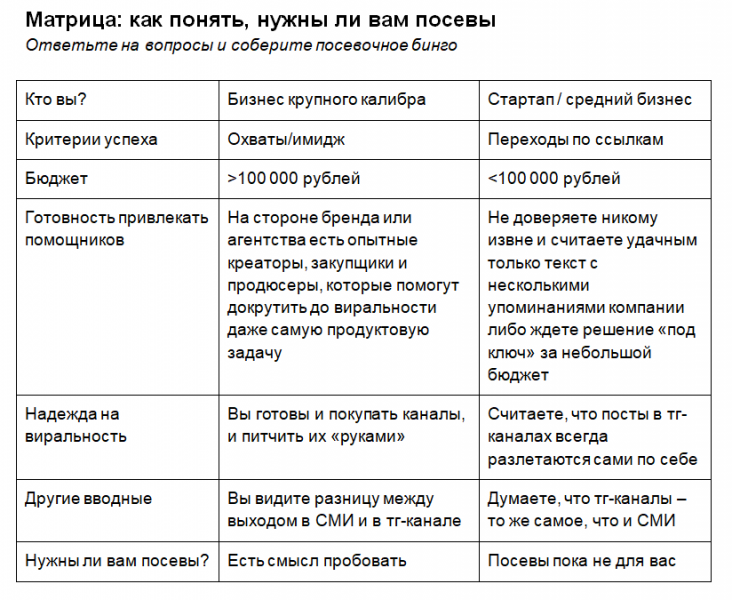 - Часто посев нужен еще вчера. То есть придумать идею и купить публикации в каналах нужно быстро — а крупные компании быстро не умеют. Хотя бы из-за бухгалтерии. Здесь на помощь и приходят команды вроде нашей: мы быстро оплачиваем посты каналам, а клиент платит нам уже позже, с комиссией.