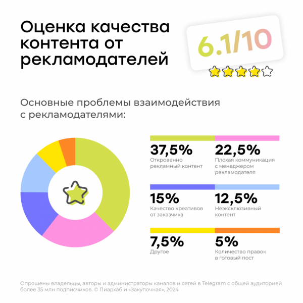 Выяснили, что основная проблема между владельцами каналов и рекламодателями — это откровенно рекламный контент. Средняя оценка того, что каналам приносят бренды, — всего 6.1 балла из 10. Рынку есть куда расти.