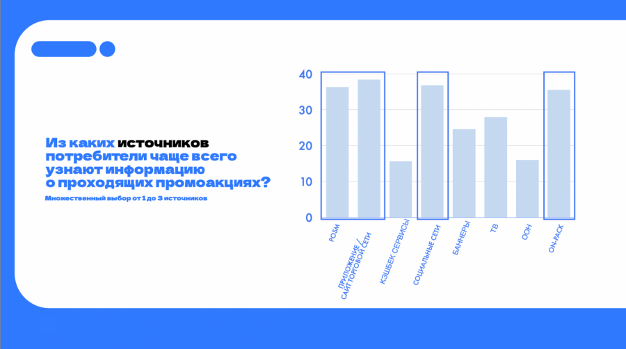 Самые популярные среди потребителей каналы информирования об акциях неразрывно связаны с ритейлерами — это приложение или сайт торговой сети, POSM. Лидеры среди собственных каналов анонсирования брендов — социальные сети и on-pack.