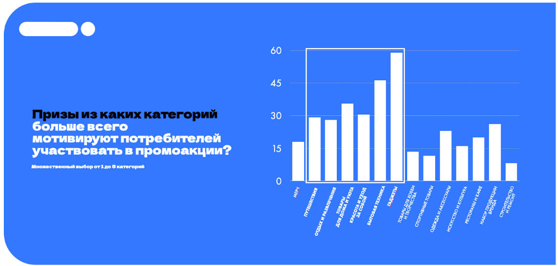 Среди самых популярных призовых категорий — гаджеты, бытовая техника, товары для дома и уюта, ухода за собой, а также путешествия и развлечения. Ключевые категории отражают фокус потребителей на впечатлениях, эмоциях, внимании к себе и к пространству своего дома.