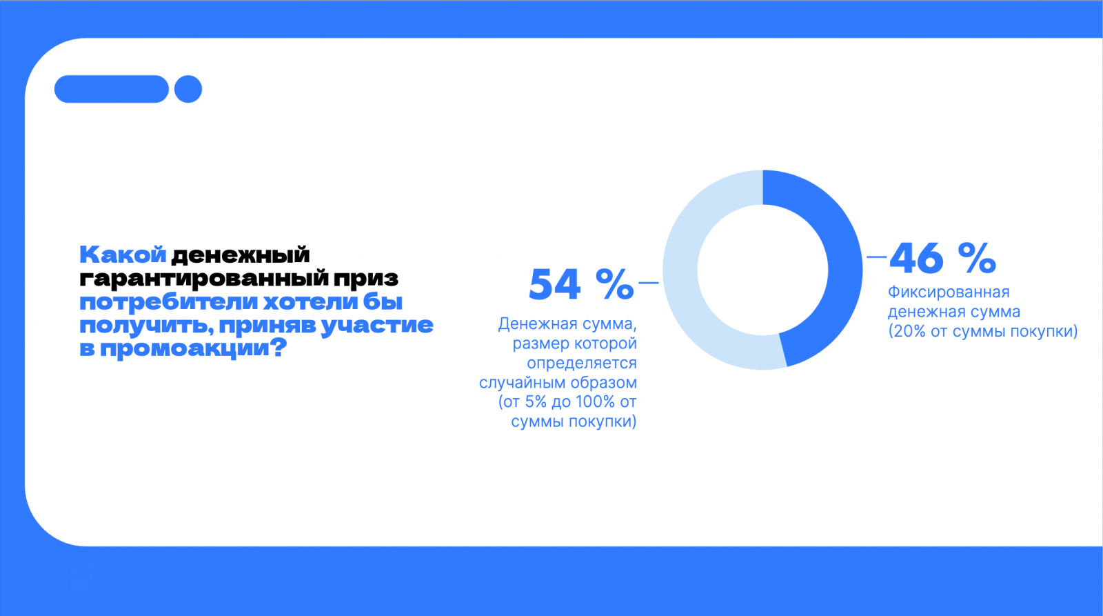 Более половины респондентов предпочли бы более «азартный» способ выдачи денежного гарантированного приза — случайное начисление кешбэка в размере от 5% до 100% от суммы покупки.