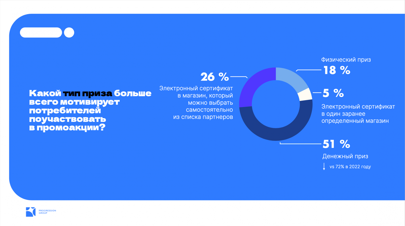 Перераспределение части аудитории с денежного приза в сегмент универсальных сертификатов может быть связано с тем, что потребители не привыкли тратить свободные деньги в свое удовольствие, предпочитая откладывать их. Сертификат же предполагает совершение покупки у одного из партнеров, что принесет человеку положительные эмоции с большей долей вероятности.