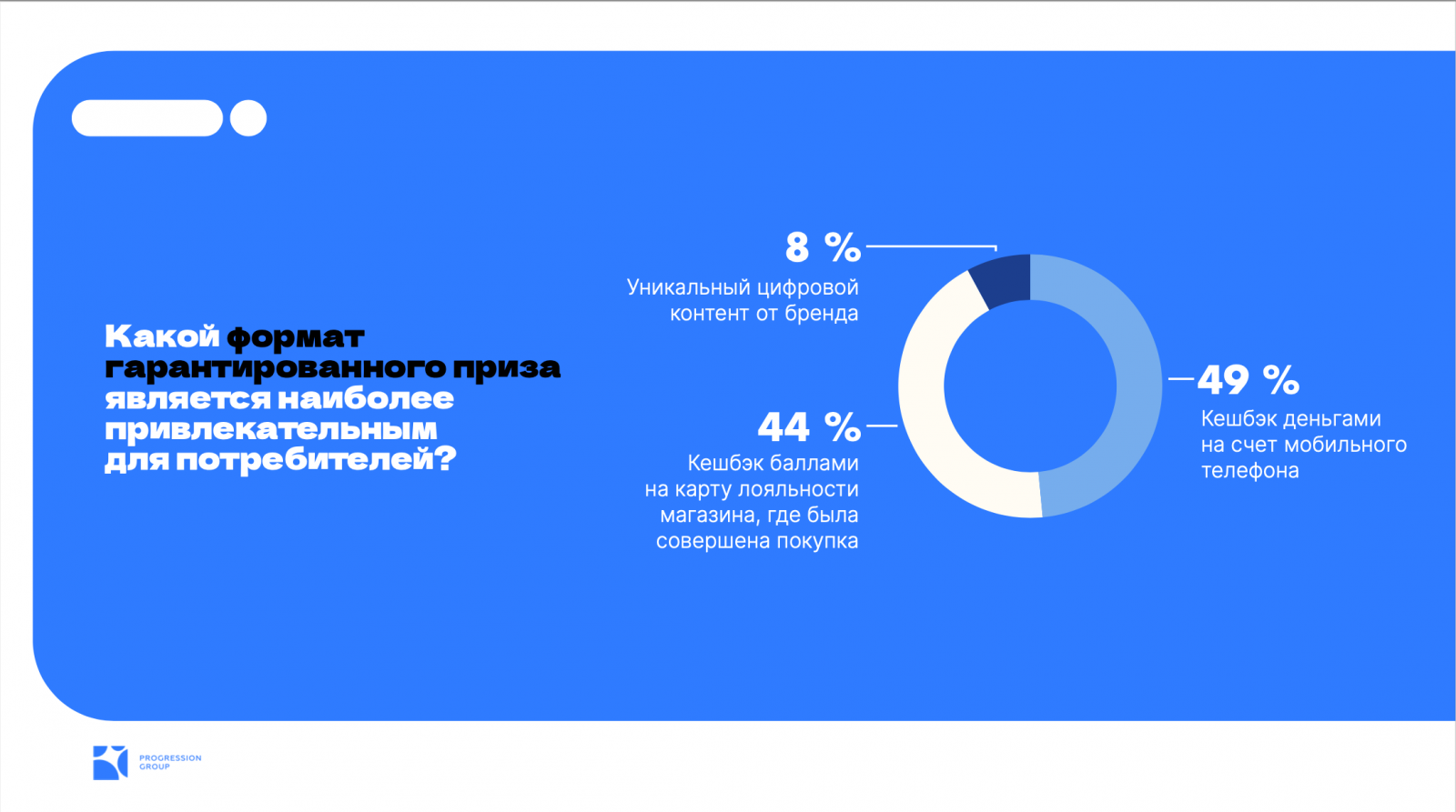 В сравнении с кешбэком, контент от бренда в качестве гарантированного приза значительно менее популярен, однако его использование в кампании может быть целесообразно при низких бюджетах или в качестве дополнительного инструмента для транслирования креативной идеи.