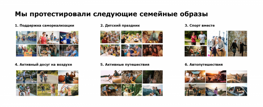 Авторы исследования изучили шесть основных семейных сценариев: «Поддержка самореализации», «Детский праздник», «Спорт вместе», «Активный досуг», «Активные путешествия» и «Автопутешествия». В ходе анализа они определили образы, наиболее эффективно влияющие на потребителей, способствующие формированию позитивного восприятия бренда и стимулирующие покупательскую активность.