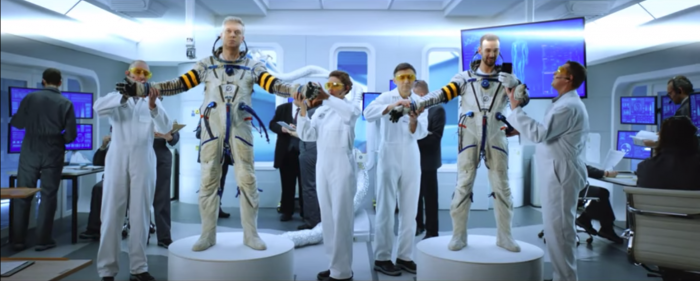 Роль старшего космонавта сыграл актер и шоумен Сергей Светлаков – лицо бренда «Билайн». Последнюю сцену снимали очень быстро: в скафандрах было практически невозможно дышать, поэтому после дублей открывали шлемы, чтобы актеры могли вздохнуть. Для имитации невесомости им пришлось балансировать на гимнастических шарах.