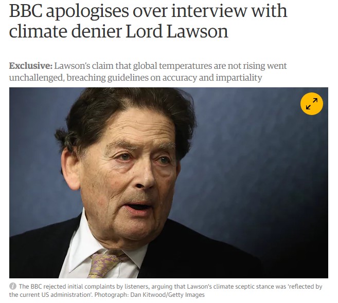 Телерадиовещательной корпорации «Би-би-си» пришлось извиниться за интервью с лордом Найджелом Лоусоном. В нем политик утверждал, что в последние годы наблюдается снижение среднемировых показателей температуры, хотя в действительности происходит обратное. На редакцию обрушился поток жалоб, обвиняющих журналистов в том, что они не попытались поставить под сомнение приведенные данные. «Би-би-си» выпустила заявление, в котором признала нарушение собственных редакционных стандартов.
