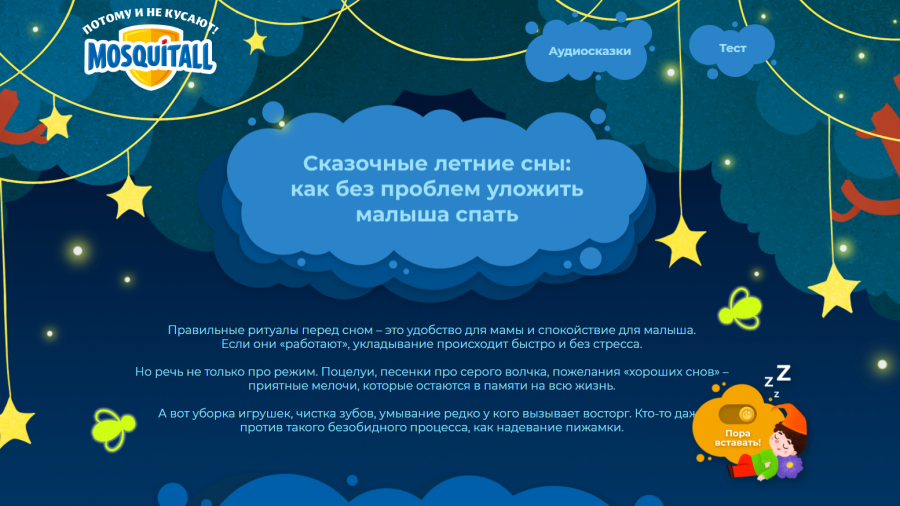 Все шесть сказок размещены на сайте baby.ru, однако в свободном доступе только две из них. Услышать остальные можно, просканировав QR-код на упаковке товаров Mosquitall. Истории не связаны между собой, брендинг в них не встречается, но есть безобидные насекомые, которые выступают положительными героями. Кроме того, одна сказка сделана в формате детского ASMR.