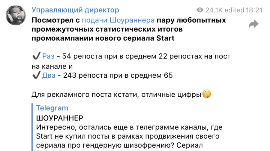 Подход позволил в разы увеличить результативность посевов, что отметили коллеги по индустрии, подсчитав количество репостов и сравнив его со средними показателями для рекламных публикаций в каналах.