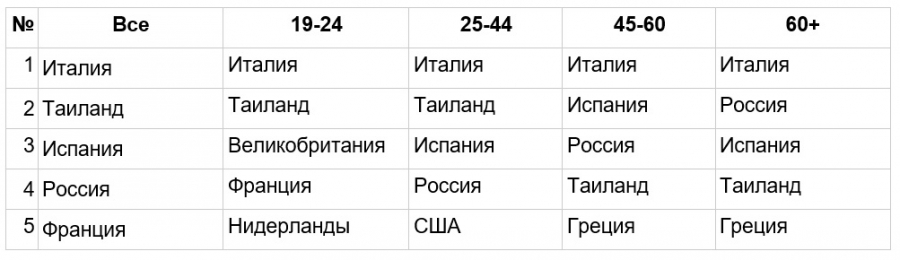 Если же смотреть на рейтинги по возрастам, Италия снова вырывается в лидеры: она нравится всем. Таиланд ставят на второе место молодые люди (19−24 и 25−44). Путешественники постарше (45−60) предпочитают Испанию, а пожилые люди 60+ любят ездить по России. Россияне младше 25 лет родину для путешествий рассматривают не так часто (она занимает 6 место их рейтинга), зато в топ-5 включают Нидерланды.