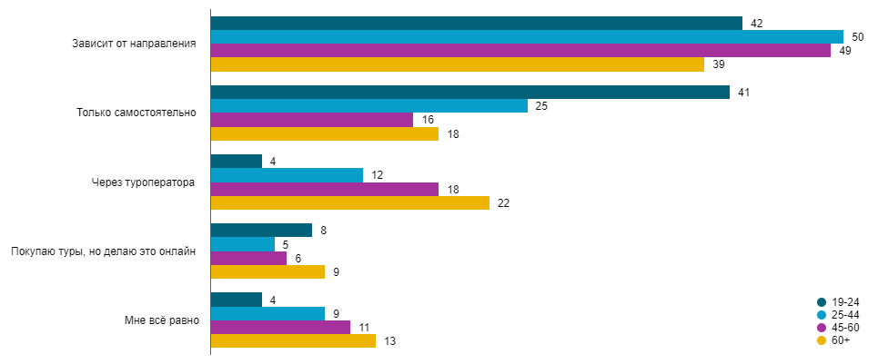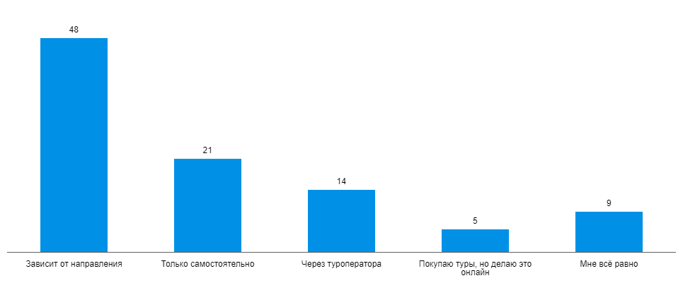 Почти половина путешественников планирует поездки в зависимости от направления: вероятнее всего, это означает, что пакетные туры в популярные курортные страны опрошенные приобретают у туроператоров, а билеты в страны Европы покупают самостоятельно. Каждый пятый путешественник всегда организует свой отдых самостоятельно, для мужчин это характерно в большей степени. 14% всегда прибегают к помощи туроператора. А вот покупка туров через интернет — наименее популярный ответ, так делают только 5% опрошенных. Причём эта статистика незначительно зависит от пола.