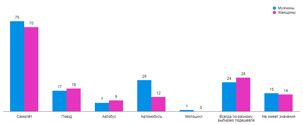 Мужчины в два раза чаще женщин ездят отдыхать на автомобиле: этот вариант выбрала четверть опрошенных путешественников мужского пола. Женщины же относятся к планированию поездок более практично и чаще сравнивают цены, поэтому в 28,4% случаев выбирают вариант подешевле. Кроме того, они чуть чаще путешествуют на поездах и автобусах.