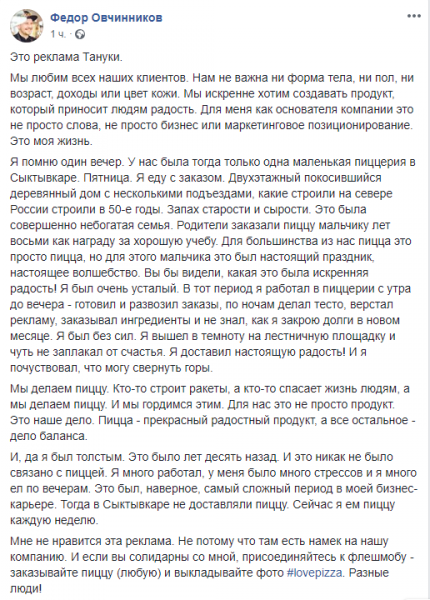 Овчинников отреагировал на провокацию: «Мы любим всех наших клиентов. Нам не важна ни форма тела, ни пол, ни возраст, доходы или цвет кожи. Мы искренне хотим создавать продукт, который приносит людям радость. Для меня как основателя компании это не просто слова, не просто бизнес или маркетинговое позиционирование. Это моя жизнь».