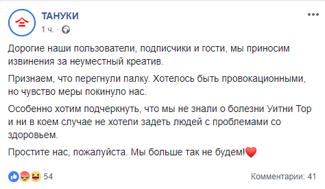 Сеть японских ресторанов «Тануки» разместили на своей странице пост, в котором они извинились за «неуместный креатив». «Мы больше так не будем», — пообещали представители сети японской кухни.