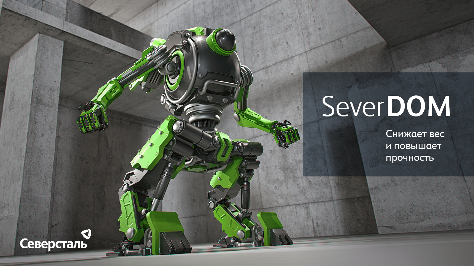 SeverDOM — легкий и надежный, этот робот демонстрирует основные качества своего продукта: повышенную прочность, позволяющую снижать вес готового изделия, а также способность к холодному формованию. Робот SeverDOM изображен на фоне бетонных стен. При сохранении высокой прочности и оптимальной пластичности формуемая сталь позволяет снизить массу готовых конструкций и таким образом значительно сэкономить на материале.