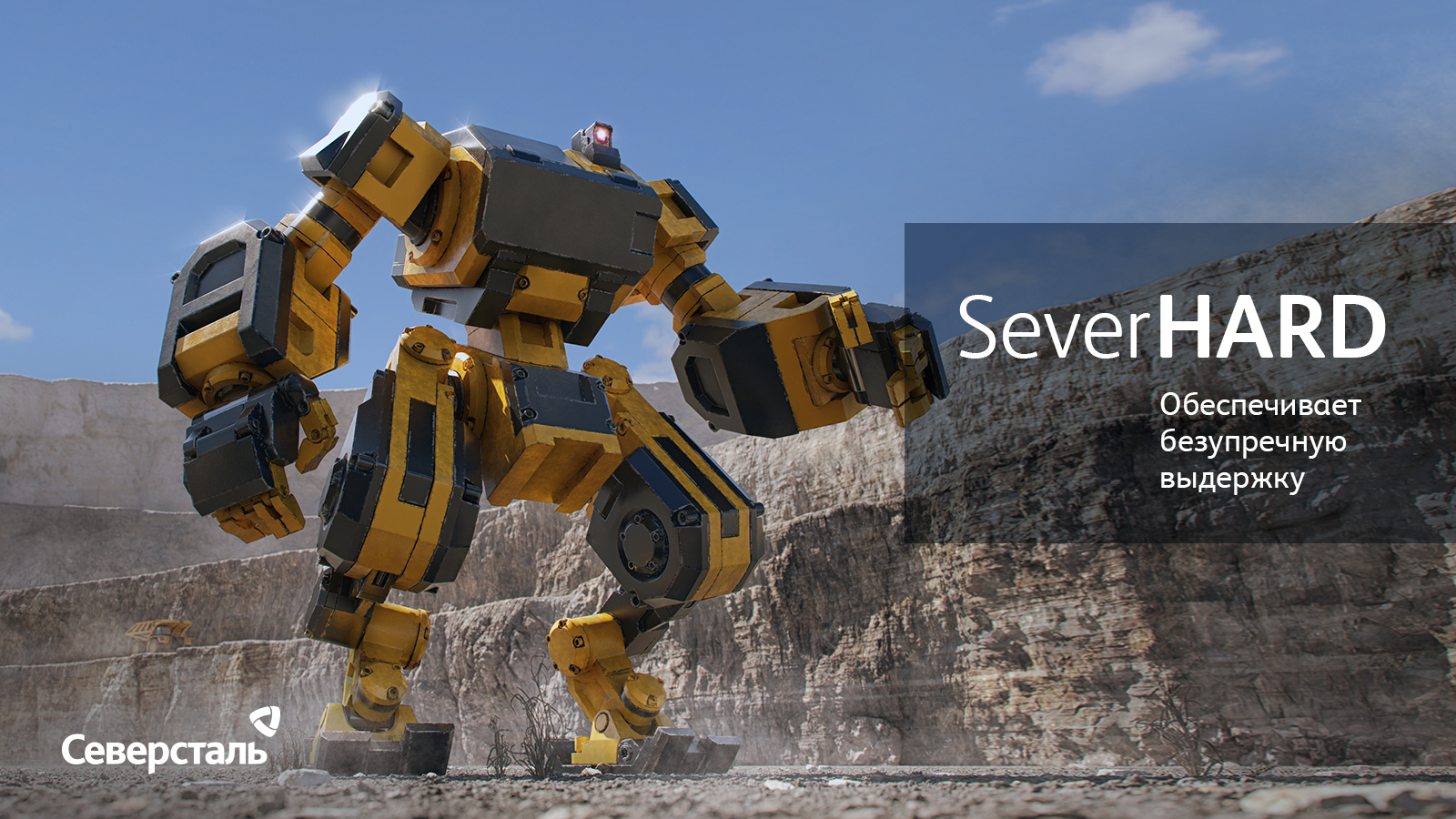 SeverHARD — сильный и «брутальный» робот, выбранный для данного продукта, демонстрирует прочность, надежность и износостойкость стали. SeverHARD изображен на фоне карьера, что указывает на его прочность и возможность использования в тяжелых условиях. Эта износостойкая сталь примененяется в изготовлении кузовов самосвалов, платформ для большегрузных автомобилей, элементов автопогрузчиков и тягового оборудования.