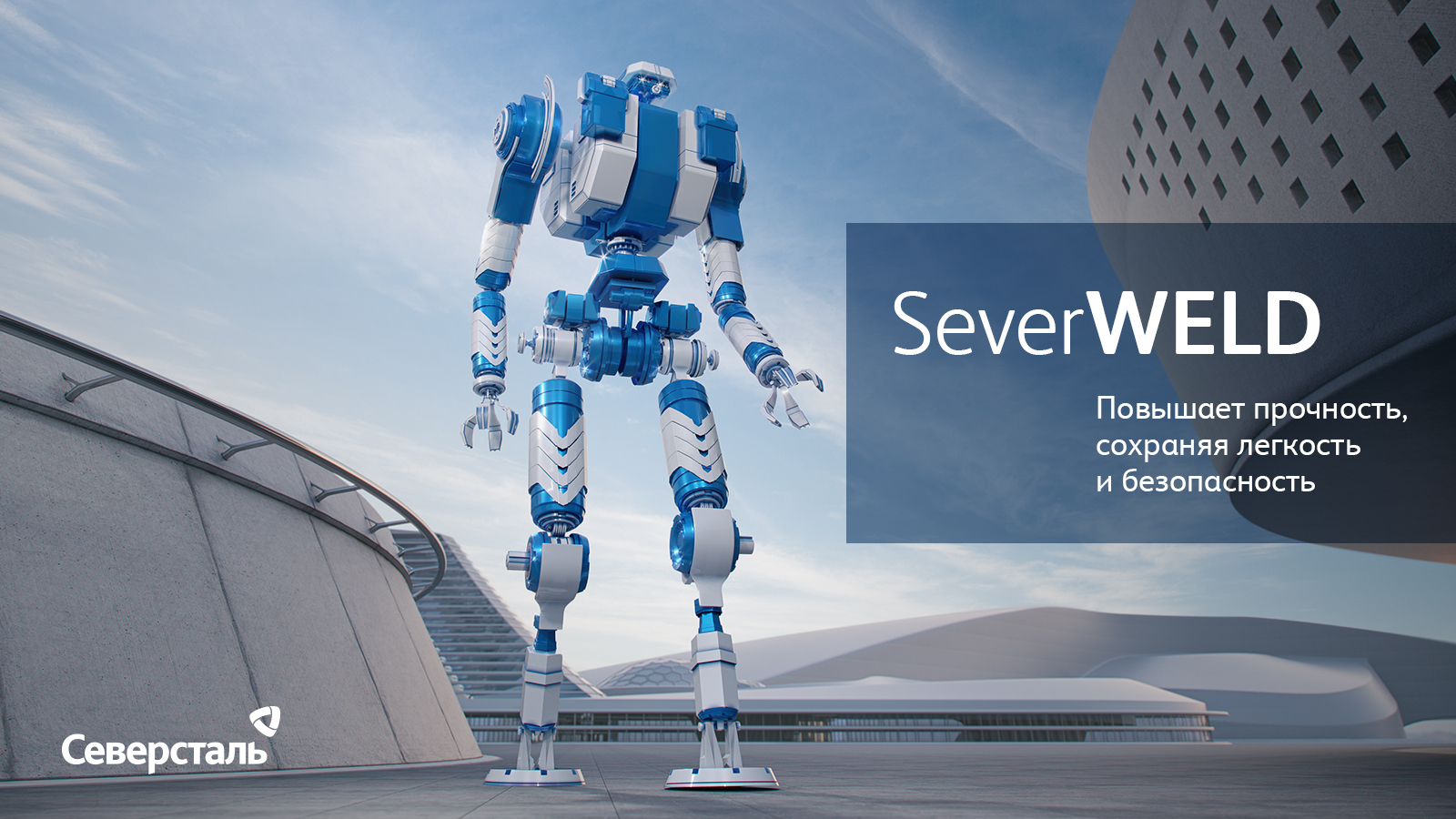 SeverWELD — легкий и пластичный, но при этом прочный и надежный робот. Он изображен на фоне здания в футуристичном стиле. Высокоэффективная сталь при своей легкости остается прочной и безопасной, благодаря чему ее применяют в строительстве.