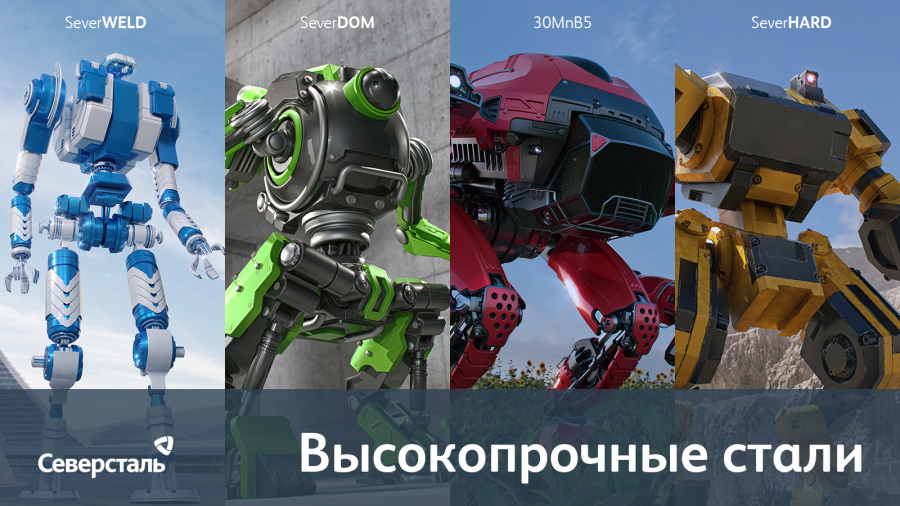 Компания «Северсталь» запустила рекламную кампанию для продвижения линейки высокопрочных марок стали. Её главными героями стали четыре робота, у каждого из которых — свой образ в зависимости оттого, какую марку стали он представляет.