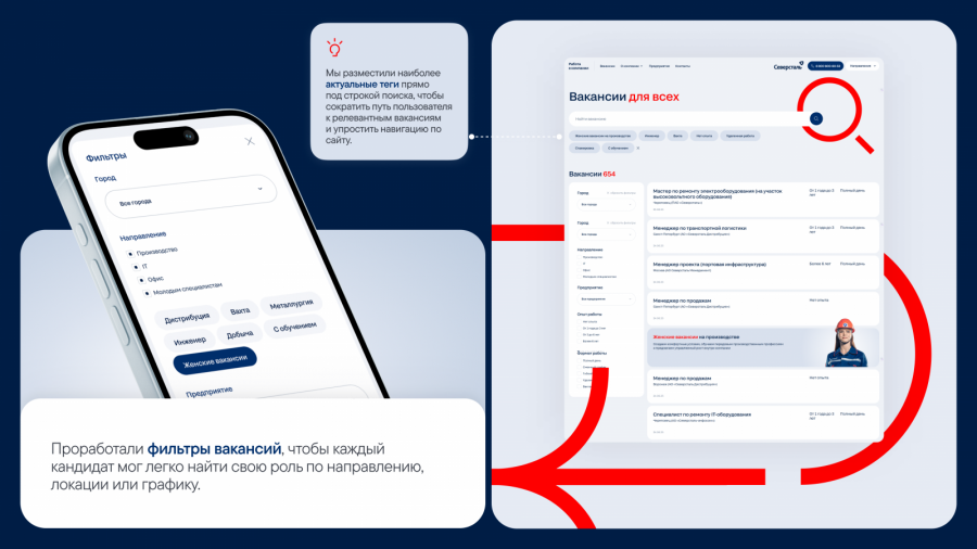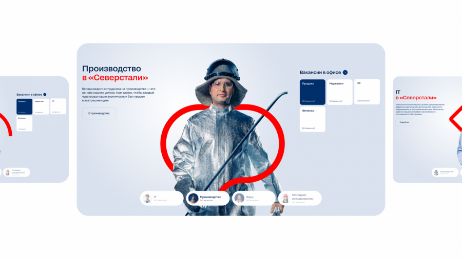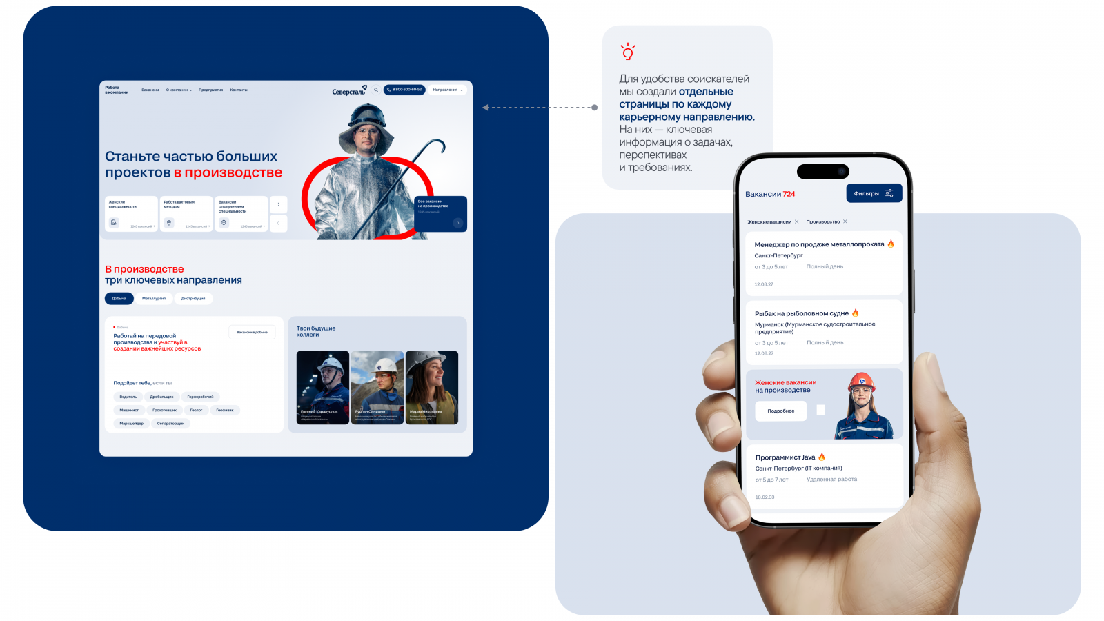 Работа над карьерным порталом «Северстали» стала для нас ценнейшим опытом. Совместными усилиями мы создали уникальный цифровой продукт, который задает новые стандарты в индустрии и ломает стереотипы о работе в промышленности. Это больше, чем просто список вакансий, — это инструмент, отражающий масштаб и ценности бренда и помогающий выстраивать диалог с соискателями на качественно новом уровне.
