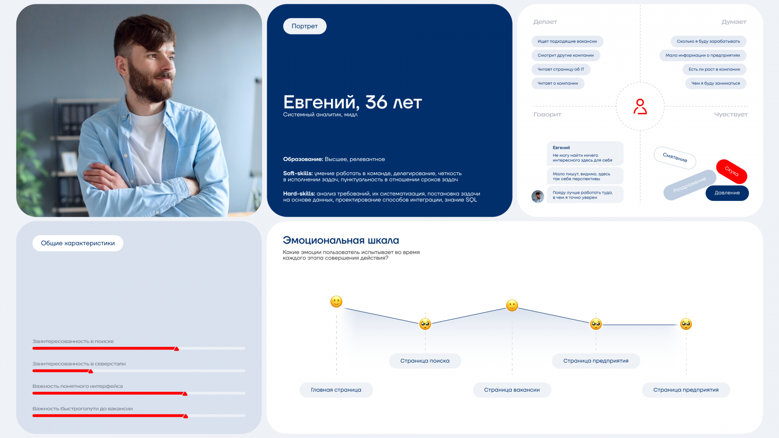 На первом этапе разработки был проведен комплексный анализ существующей платформы. Это позволило выявить проблемные зоны и сформулировать гипотезы для их решения. В рамках анализа были изучены HR-метрики, проведен UX-аудит, анализ веб-аналитики и бенчмаркинг, а также детально проанализированы портреты целевой аудитории. Важным этапом анализа стала карта пользовательского пути (CJM), которая систематизировала полученные данные и сформировала целостное представление о взаимодействии соискателя с порталом.