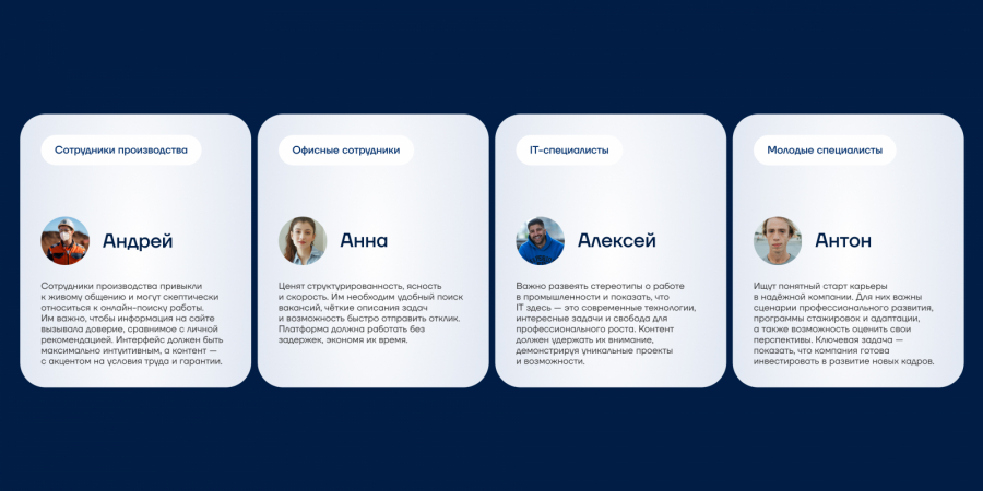 Новый сайт должен был не просто рассказать о компании, а ясно передать новый EVP и обеспечить комфортный пользовательский опыт для всех ключевых сегментов аудитории: производственного персонала, IT-специалистов, офисных сотрудников и молодых специалистов.