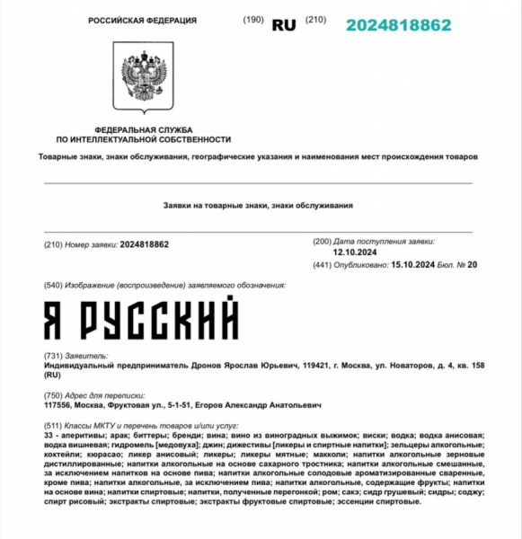 Классификация одной из них (33 класс Международной классификации товаров и услуг (МКТУ) позволяет выпускать вино, ликёры, настойки и крепкий алкоголь. Вторая заявка по 17 классам МКТУ, в частности, ориентирована на выпуск косметики, безалкогольных напитков, снеков и множества других товаров.